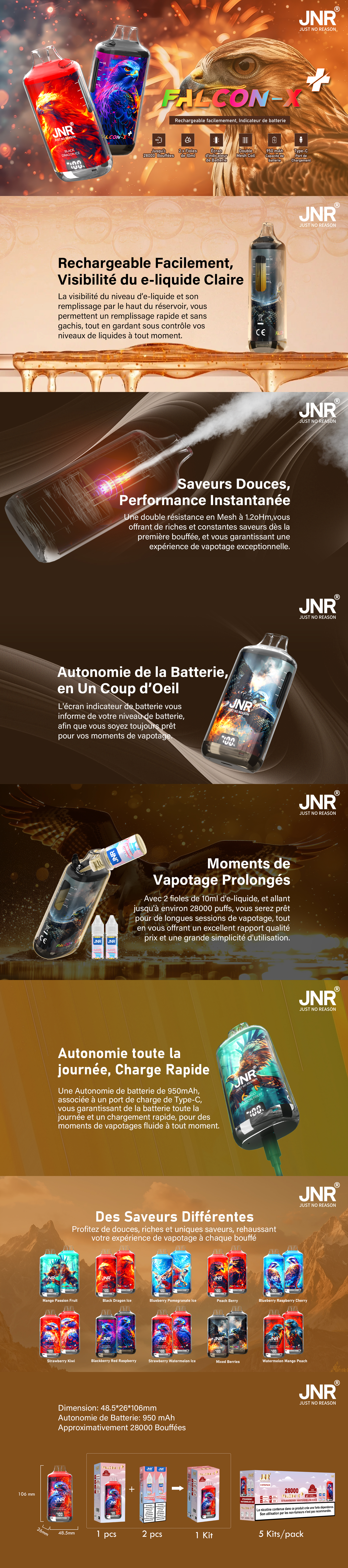 Découvrez la nouvelle Puff JNR Falcon-X 28K, une vape rechargeable offrant jusqu'à 28 000 bouffées, avec 2 ml de liquide intégré accompagné de deux flacons de 10 ml 20mg pour prolonger votre expérience de vapotage avec élégance et facilité
